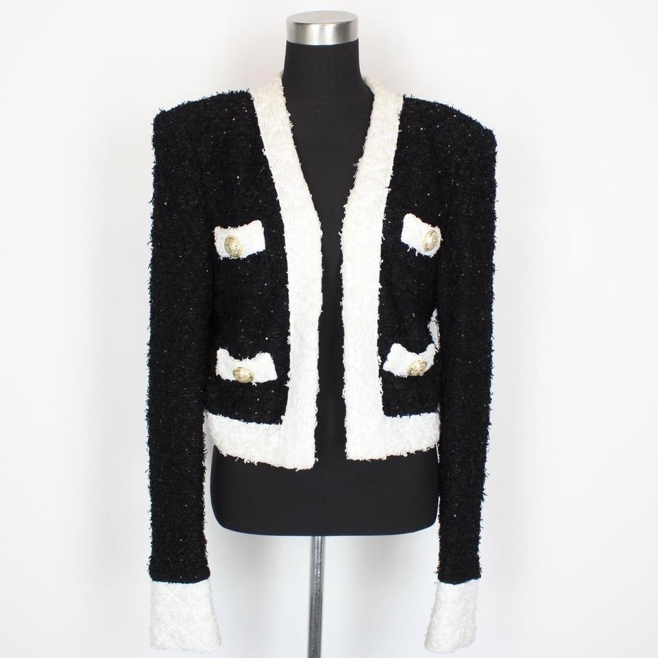 Balmain Paris Black and White Tweed Collarless Blazer Jacket