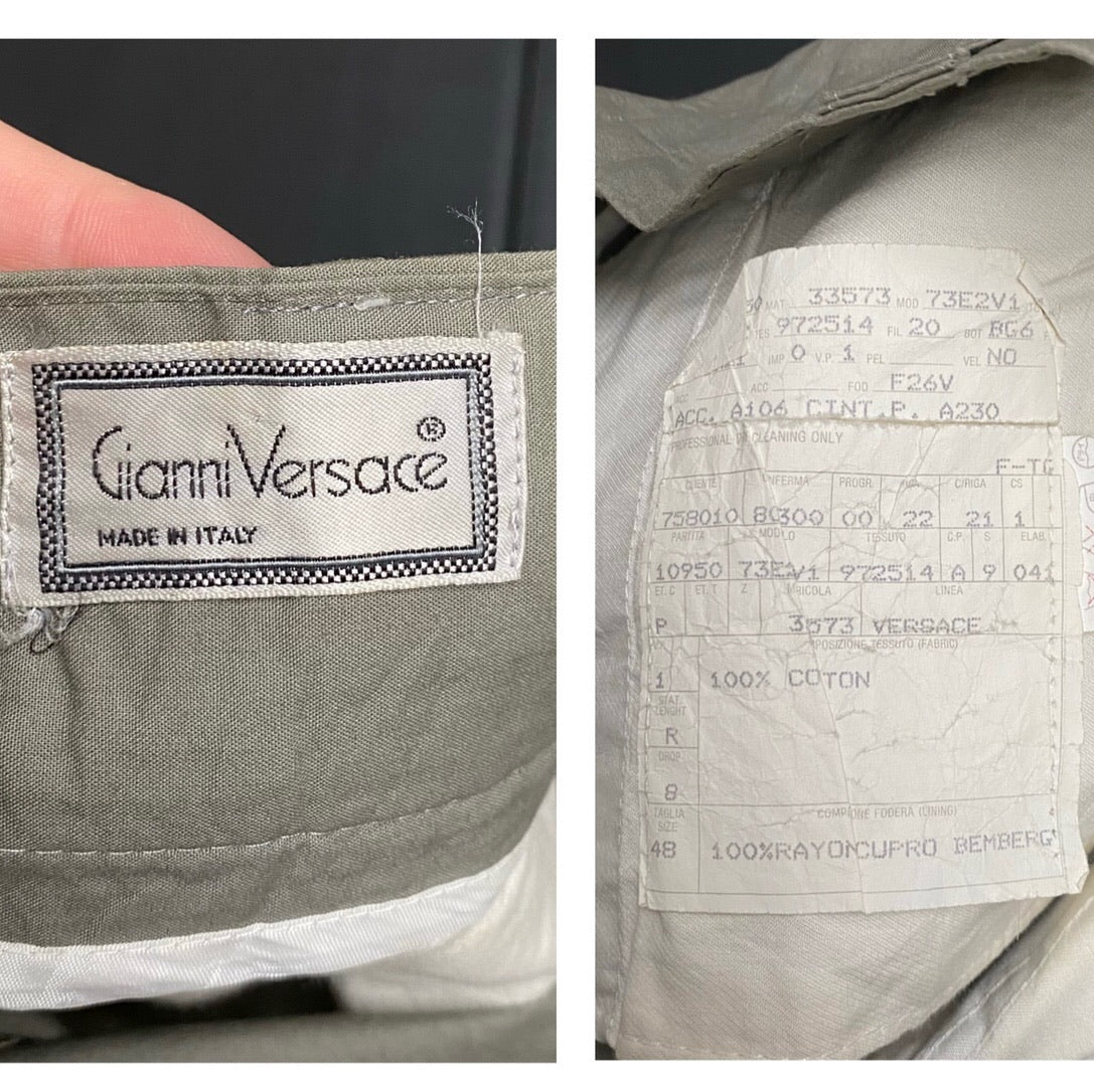 Vintage 90's Gianni Versace Green Straight Leg Pleated Trousers Size on label: 48 Our recommended size: Medium Waist (inches): 32 Inside Leg (inches): 30 All products listed are vintage unless stated otherwise in the description. These items are pre-loved and pre-worn, resulting in small signs of wear and minor fading. We think this adds to their unique authenticity, but if an item has any major flaws these will be stated below. Please contact us if you have any further questions!