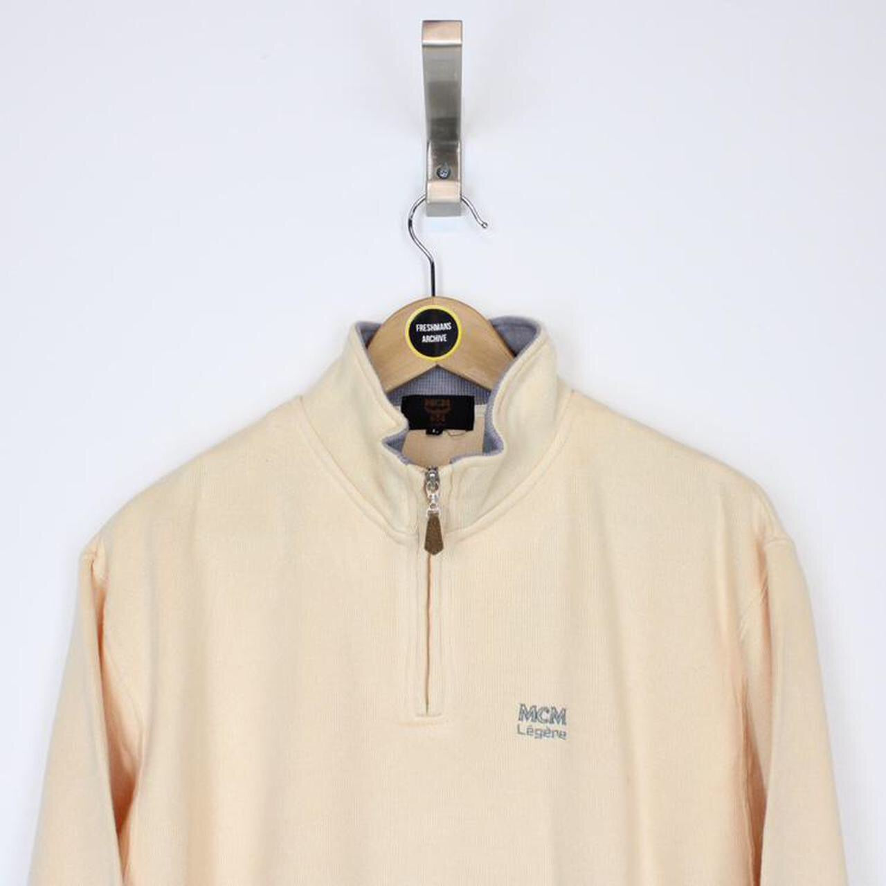 Vintage 90's MCM Yellow Pullover 1/4 Zip Spellout Sweatshirt Jumper Size on label: Large Our recommended size: Medium Pit to pit (inches): 22 Length (inches): 26 All products listed are vintage unless stated otherwise in the description. These items are pre-loved and pre-worn, resulting in small signs of wear and minor fading. We think this adds to their unique authenticity, but if an item has any major flaws these will be stated below. Please contact us if you have any further questions!