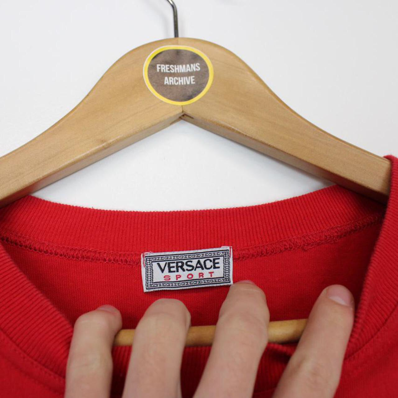 Vintage 90's Versace Red Spellout Long Sleeve T-Shirt Size on label: 46 Our recommended size: Small Pit to pit (inches): 21 Length (inches): 25 All products listed are vintage unless stated otherwise in the description. These items are pre-loved and pre-worn, resulting in small signs of wear and minor fading. We think this adds to their unique authenticity, but if an item has any major flaws these will be stated below. - The t-shirt does have a mark to the front, this is reflected in the price Please contact us if you have any further questions!