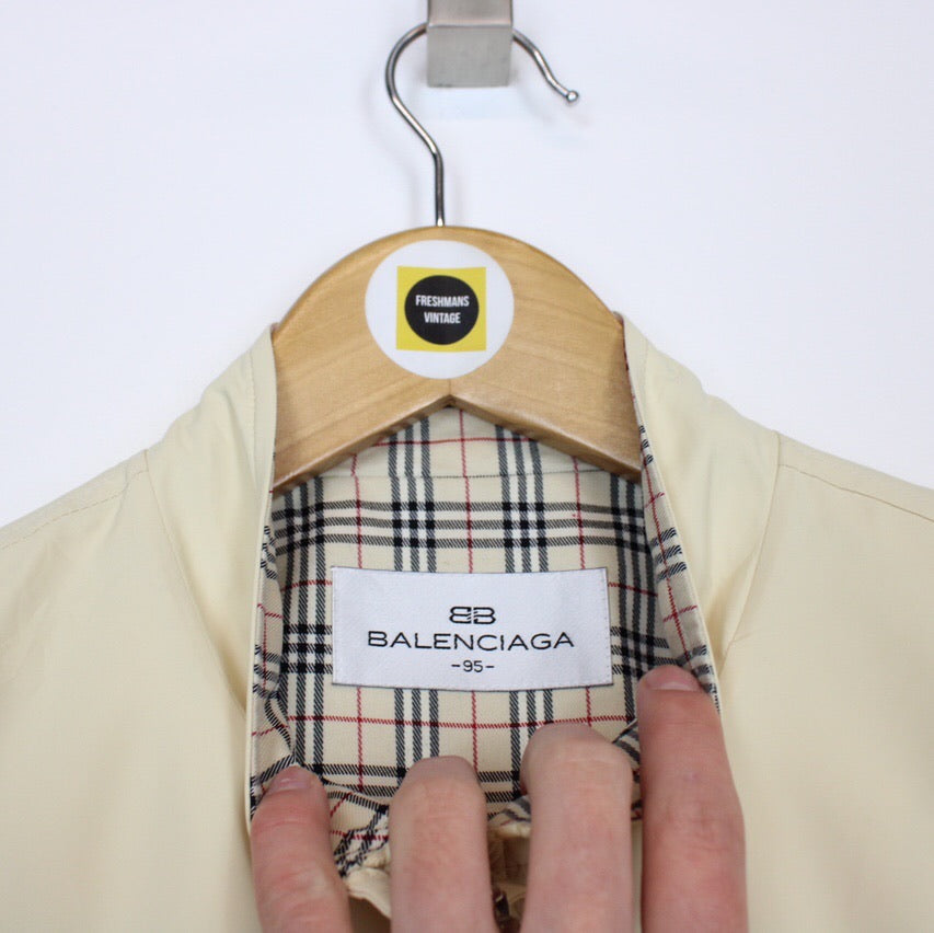 Vintage 90's Balenciaga Beige Nova Check Full Zip Spellout Jacket Size on label: 95 Our recommended size: Small Pit to pit (inches): 20 Length (inches): 26.5 All products listed are vintage unless stated otherwise in the description. These items are pre-loved and pre-worn, resulting in small signs of wear and minor fading. We think this adds to their unique authenticity, but if an item has any major flaws these will be stated below. Please contact us if you have any further questions!