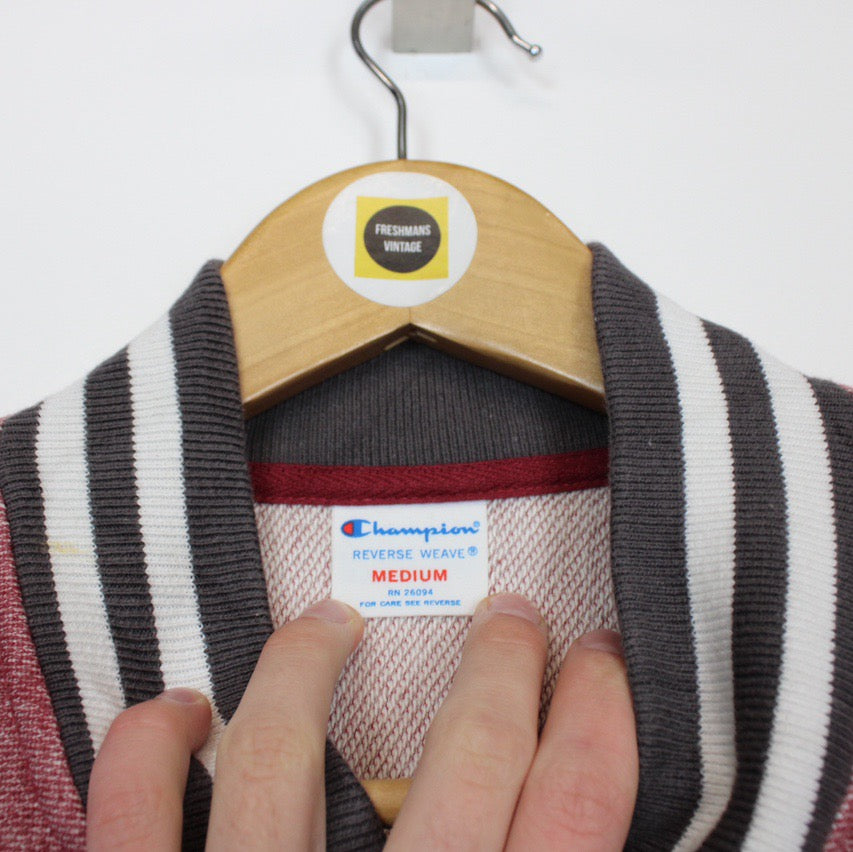 Vintage 90's Champion Reverse Weave Burgundy Full Zip Varsity Jacket Size on label: Medium Our recommended size: Medium Pit to pit (inches): 20 Length (inches): 27.5 All products listed are vintage unless stated otherwise in the description. These items are pre-loved and pre-worn, resulting in small signs of wear and minor fading. We think this adds to their unique authenticity, but if an item has any major flaws these will be stated below. Please contact us if you have any further questions!
