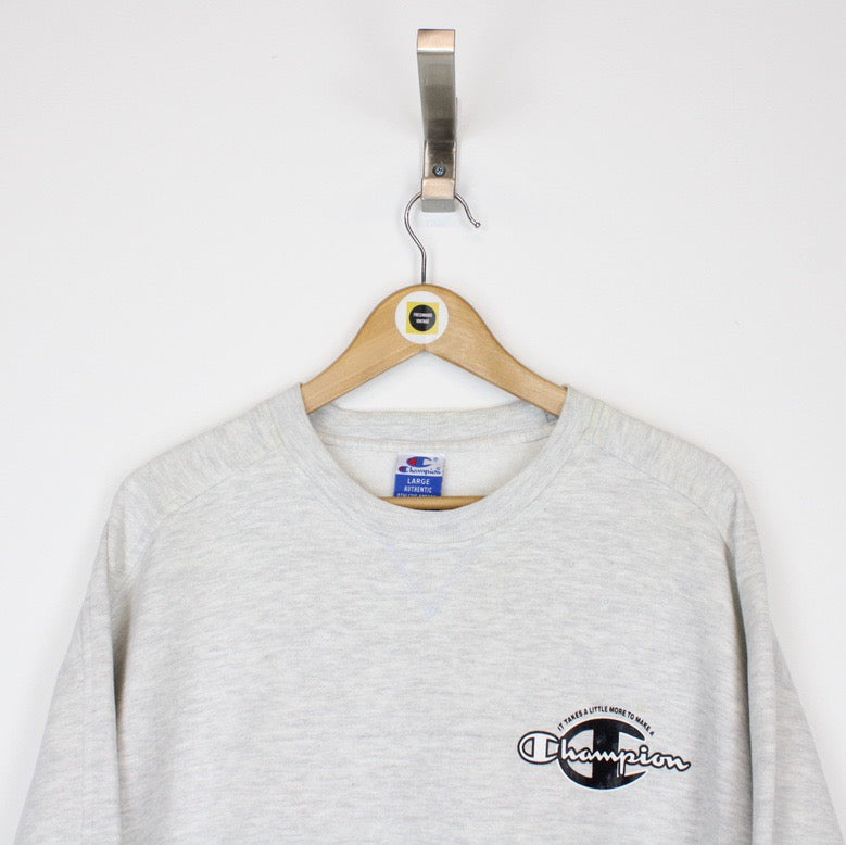 Vintage 90's Champion Grey and Black Crew Neck Spellout Sweatshirt Jumper Size on label: Large Our recommended size: Large Pit to pit (inches): 24.5 Length (inches): 27 All products listed are vintage unless stated otherwise in the description. These items are pre-loved and pre-worn, resulting in small signs of wear and sometimes minor flaws. We think this adds to their unique authenticity, but if an item has any bigger flaws these will be stated. - The sweatshirt does have a couple of light marks to the right sleeve, this is reflected in the price Please contact us if you have any further questions!