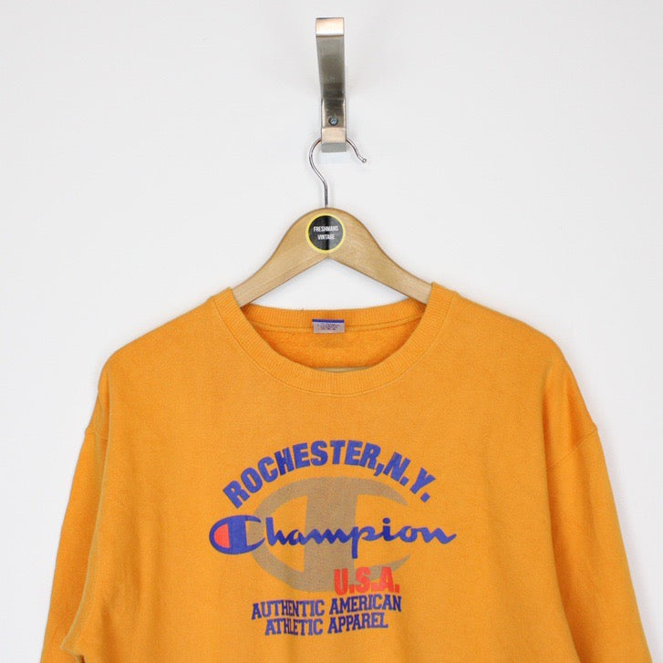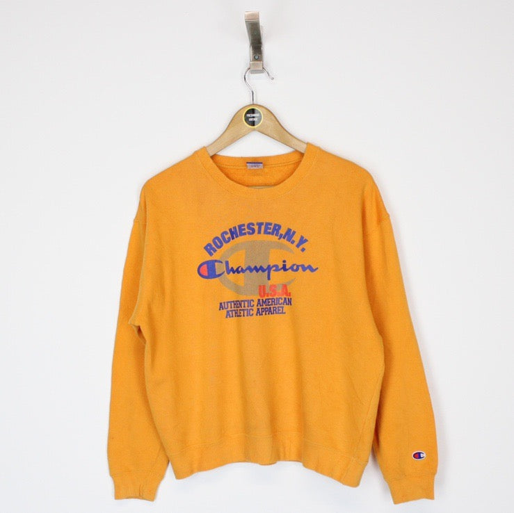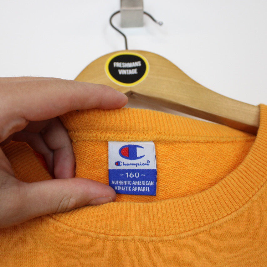 Vintage 00's Champion Rochester USA Yellow Crew Neck Spellout Sweatshirt Jumper Size on label: 160 Our recommended size: Women's Small (UK 4/6) Pit to pit (inches): 20.5 Length (inches): 21 All products listed are vintage unless stated otherwise in the description. These items are pre-loved and pre-worn, resulting in small signs of wear and minor fading. We think this adds to their unique authenticity, but if an item has any major flaws these will be stated below. Please contact us if you have any further questions!