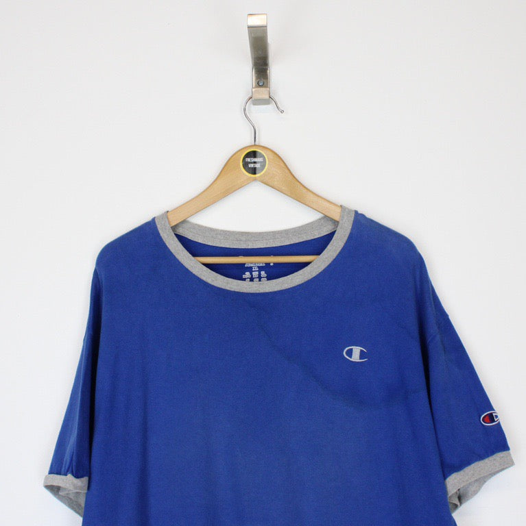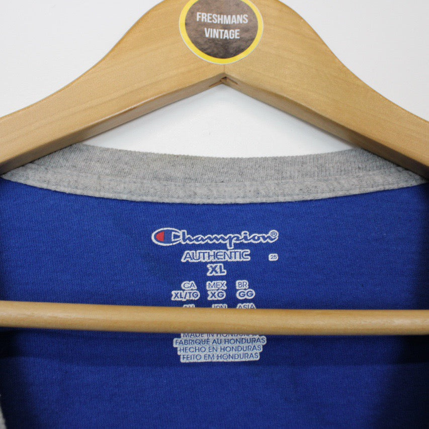 Vintage 00's Champion Blue Crew Neck Short Sleeve T-Shirt Size on label: XL Our recommended size: XL Pit to pit (inches): 23 Length (inches): 28.5 All products listed are vintage unless stated otherwise in the description. These items are pre-loved and pre-worn, resulting in small signs of wear and sometimes minor flaws. We think this adds to their unique authenticity, but if an item has any bigger flaws these will be stated. - The t-shirt does have a mark to the front and back (see pictures), this is reflected in the price Please contact us if you have any further questions!