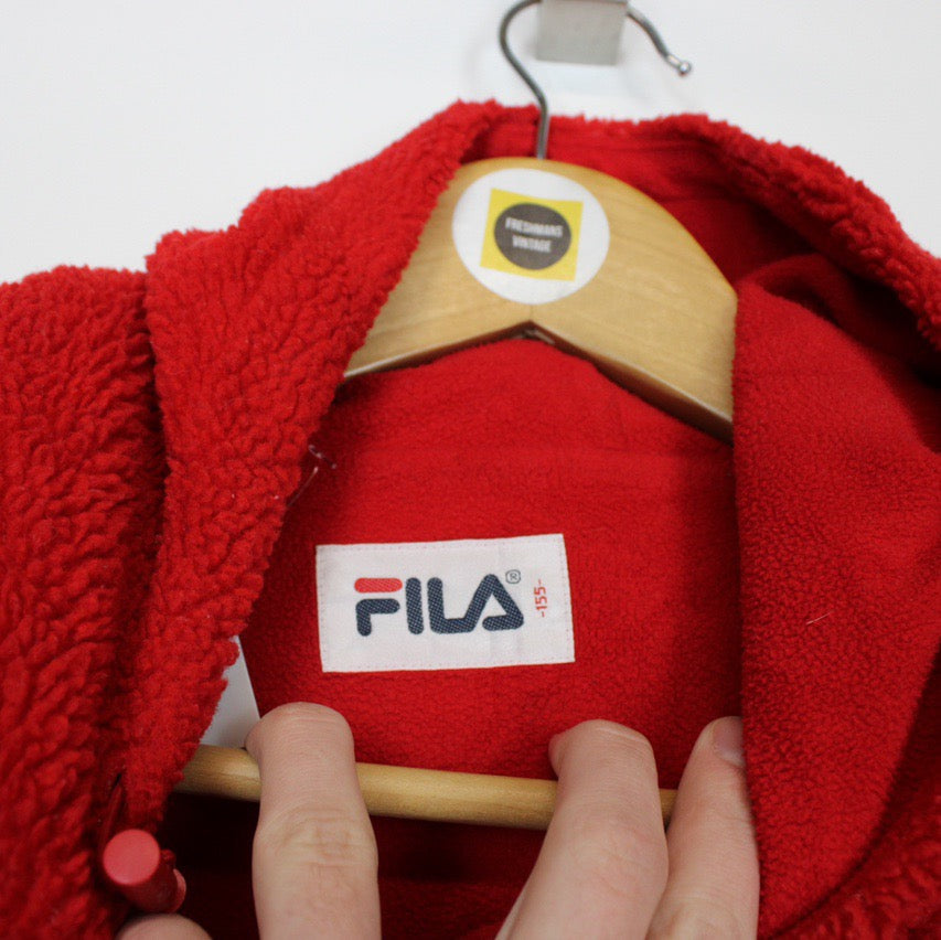 Vintage 00's Fila Red and Black Full Zip Spellout Sherpa Deep Pile Fleece Hoodie Size on label: 155 Our recommended size: Women's Medium Pit to pit (inches): 21 Length (inches): 24 All products listed are vintage unless stated otherwise in the description. These items are pre-loved and pre-worn, resulting in small signs of wear and fading. We think this adds to their unique authenticity, but if an item has any major flaws these will be stated. Please contact us if you have any further questions!