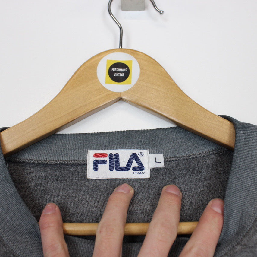 Vintage 90's Fila Grey and Navy Blue Crew Neck Spellout Sweatshirt Jumper Size on label: Women's Large Our recommended size: Women's Large Pit to pit (inches): 22 Length (inches): 25 All products listed are vintage unless stated otherwise in the description. These items are pre-loved and pre-worn, resulting in small signs of wear and minor fading. We think this adds to their unique authenticity, but if an item has any major flaws these will be stated below. Please contact us if you have any further questions!
