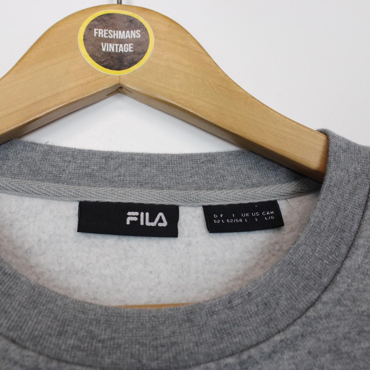 Vintage Fila Grey and Navy Blue Crew Neck Spellout Sweatshirt Jumper Size on label: Large Our recommended size: Medium Pit to pit (inches): 22 Length (inches): 26 Condition: Very good condition All our products are pre-worn unless stated otherwise in the description. These items have been worn, resulting in signs of wear and use. If an item has any major flaws these will be stated above in the condition section. Please contact us if you have any further questions!