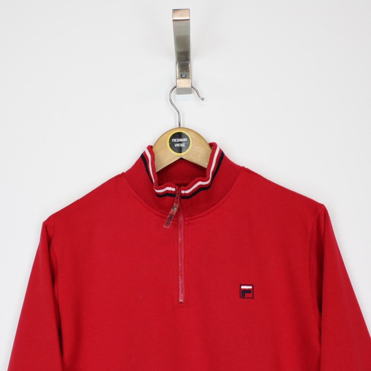 Vintage 00's Fila Red Pullover 1/4 Zip Sweatshirt Jumper Size on label: N/A Our recommended size: Small Pit to pit (inches): 20 Length (inches): 24.5 All products listed are vintage unless stated otherwise in the description. These items are pre-loved and pre-worn, resulting in small signs of wear and minor fading. We think this adds to their unique authenticity, but if an item has any major flaws these will be stated below. Please contact us if you have any further questions!