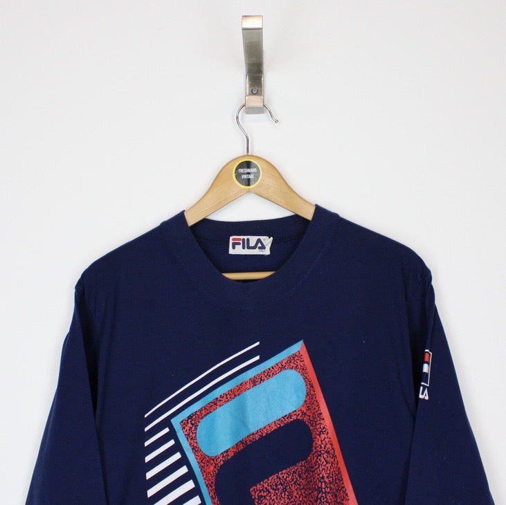 Vintage 90's Fila Navy Blue Long Sleeve Spellout T-Shirt Size on label: Large Our recommended size: M/L Pit to pit (inches): 19 Length (inches): 30.5 All products listed are vintage unless stated otherwise in the description. These items are pre-loved and pre-worn, resulting in small signs of wear and fading. We think this adds to their unique authenticity, but if an item has any major flaws these will be stated. Please contact us if you have any further questions!