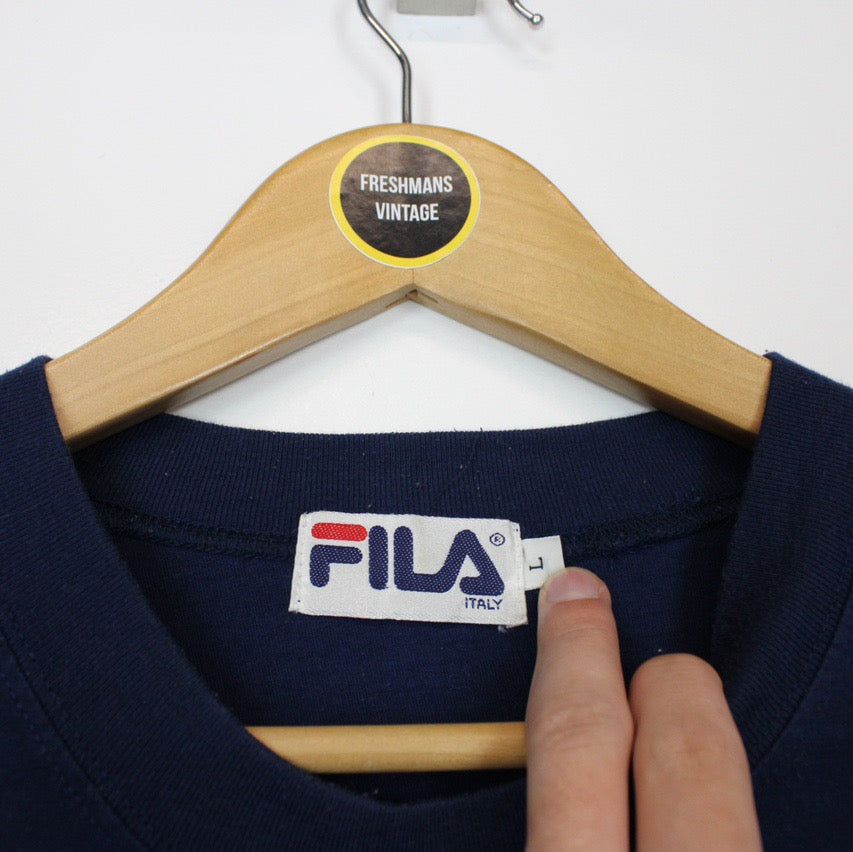 Vintage 90's Fila Navy Blue Long Sleeve Spellout T-Shirt Size on label: Large Our recommended size: M/L Pit to pit (inches): 19 Length (inches): 30.5 All products listed are vintage unless stated otherwise in the description. These items are pre-loved and pre-worn, resulting in small signs of wear and fading. We think this adds to their unique authenticity, but if an item has any major flaws these will be stated. Please contact us if you have any further questions!