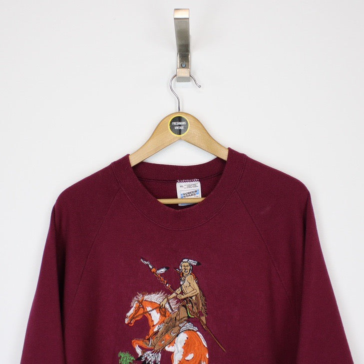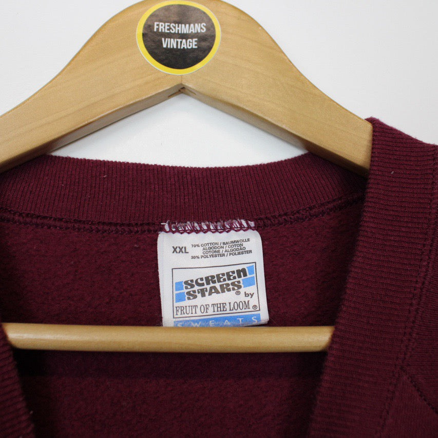 Vintage 90's Fruit of the Loom Burgundy Graphic Sweatshirt Jumper Size on label: XXL Our recommended size: XXL Pit to pit (inches): 25.5 Length (inches): 29 All products listed are vintage unless stated otherwise in the description. These items are pre-loved and pre-worn, resulting in small signs of wear and minor fading. We think this adds to their unique authenticity - The sweatshirt does have some slight discolouration to the front, this is reflected in the price Please contact us if you have any further questions!