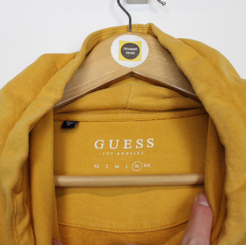 Vintage Guess Jeans USA Mustard Yellow Pullover Spellout Hoodie Jumper Size on label: XL Our recommended size: Medium Pit to pit (inches): 23 Length (inches): 26 All products listed are vintage unless stated otherwise in the description. These items are pre-loved and pre-worn, resulting in small signs of wear and sometimes minor flaws. We think this adds to their unique authenticity, but if an item has any bigger flaws these will be stated. Please contact us if you have any further questions!