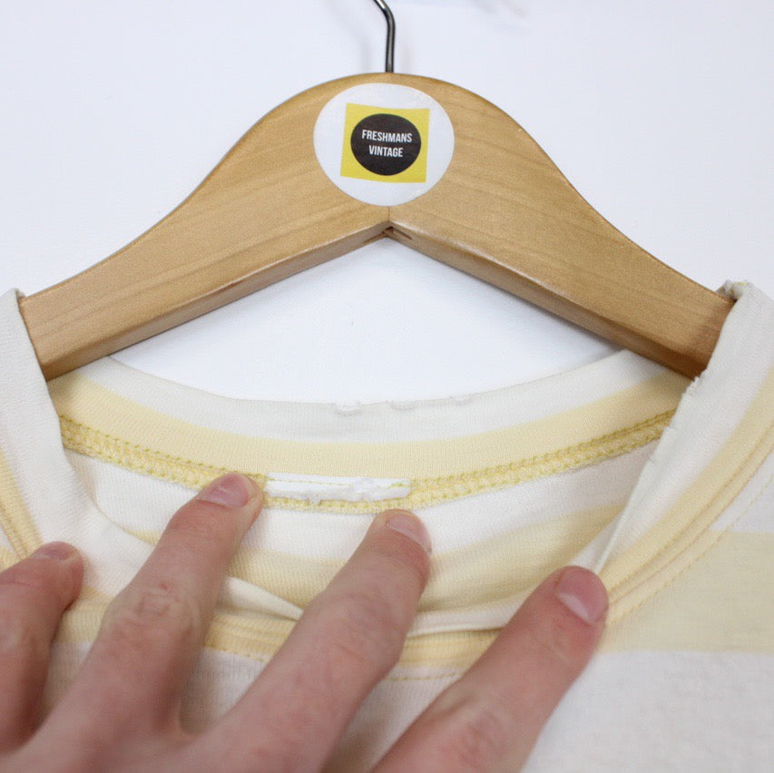 Vintage Guess Jeans by Georges Marciano Yellow and White Striped Spellout Short Sleeve T-Shirt Size on label: N/A Our recommended size: Large Pit to pit (inches): 20.5 Length (inches): 29.5 All products listed are vintage unless stated otherwise in the description. These items are pre-loved and pre-worn, resulting in small signs of wear and sometimes minor flaws. We think this adds to their unique authenticity, but if an item has any bigger flaws these will be stated. - The top does have multiple small marks throughout the front, this is reflected in the price Please contact us if you have any further questions!