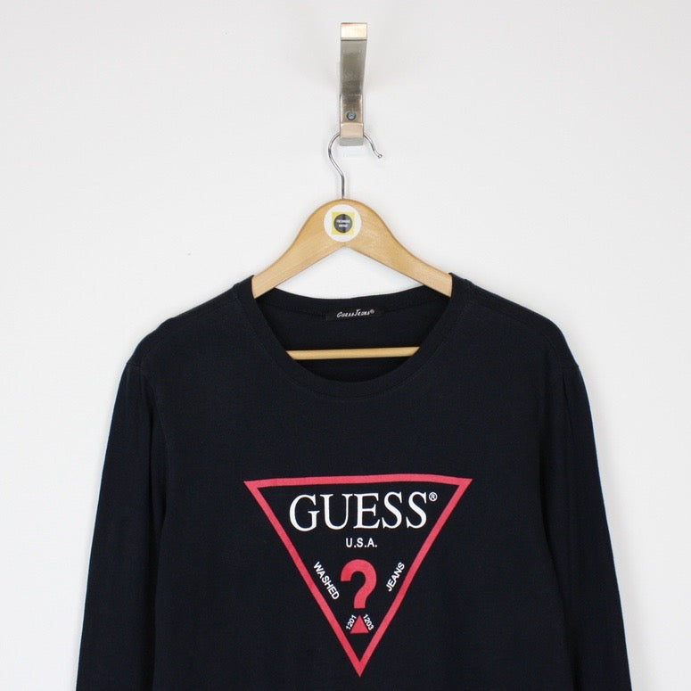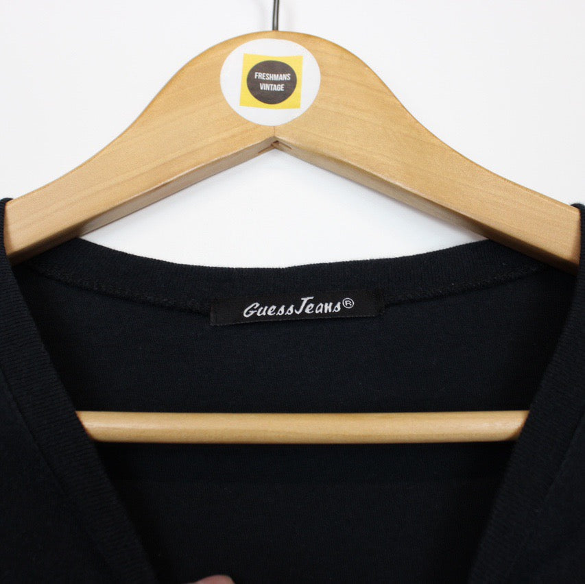 Vintage 00's Guess Jeans Black Long Sleeve Spellout T-Shirt Size on label: Medium Our recommended size: Medium Pit to pit (inches): 20.5 Length (inches): 28.5 All products listed are vintage unless stated otherwise in the description. These items are pre-loved and pre-worn, resulting in small signs of wear and sometimes minor flaws. We think this adds to their unique authenticity, but if an item has any bigger flaws these will be stated. - The t-shirt has a couple of pin holes to the front, this is reflected in the price Please contact us if you have any further questions!