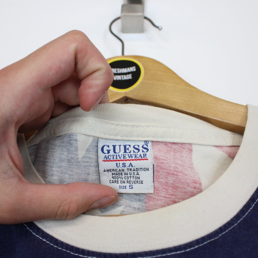 Vintage 90's Guess USA Multicoloured Short Sleeve Spellout T-Shirt Size on label: Small Our recommended size: Small Pit to pit (inches): 19 Length (inches): 25.5 All products listed are vintage unless stated otherwise in the description. These items are pre-loved and pre-worn, resulting in small signs of wear and sometimes minor flaws. We think this adds to their unique authenticity, but if an item has any bigger flaws these will be stated. - The t-shirt does have a couple of faint marks to the front, this is reflected in the price Please contact us if you have any further questions!