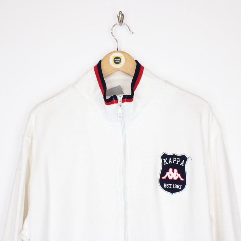 Vintage 90's Kappa White, Red and Black Zip Up Spellout Track Jacket - in very good condition, has the embroidered logo on the front - Women's size Large, 23 inches pit to pit and 25 inches length
