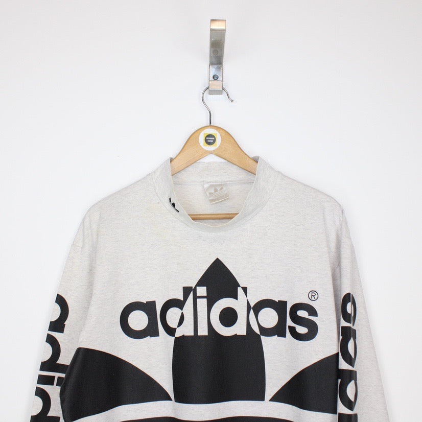 Vintage 90's Adidas Grey and Black Mock Neck Spellout Sweatshirt Jumper Size on label: N/A Our recommended size: Large Pit to pit (inches): 22.5 Length (inches): 29 All products listed are vintage unless stated otherwise in the description. These items are pre-loved and pre-worn, resulting in small signs of wear and minor fading. We think this adds to their unique authenticity, but if an item has any major flaws these will be stated below. - The sweatshirt does have a small mark to the front, this is reflected in the price Please contact us if you have any further questions!