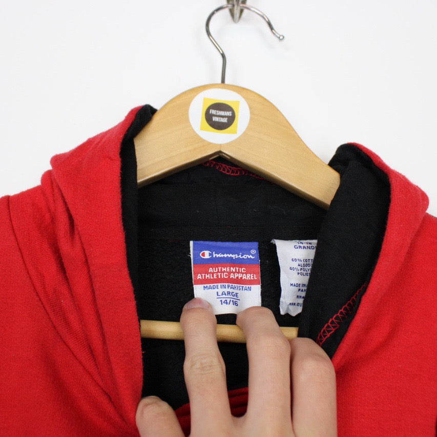 Vintage 90's Champion Red, Black and White Pullover Spellout Hoodie Jumper Size on label: Women's Large Our recommended size: Women's Large Pit to pit (inches): 21.5 Length (inches): 25 All products listed are vintage unless stated otherwise in the description. These items are pre-loved and pre-worn, resulting in small signs of wear and fading. We think this adds to their unique authenticity, but if an item has any major flaws these will be stated. Please contact us if you have any further questions!