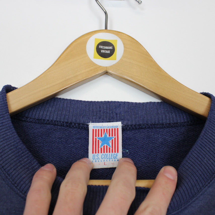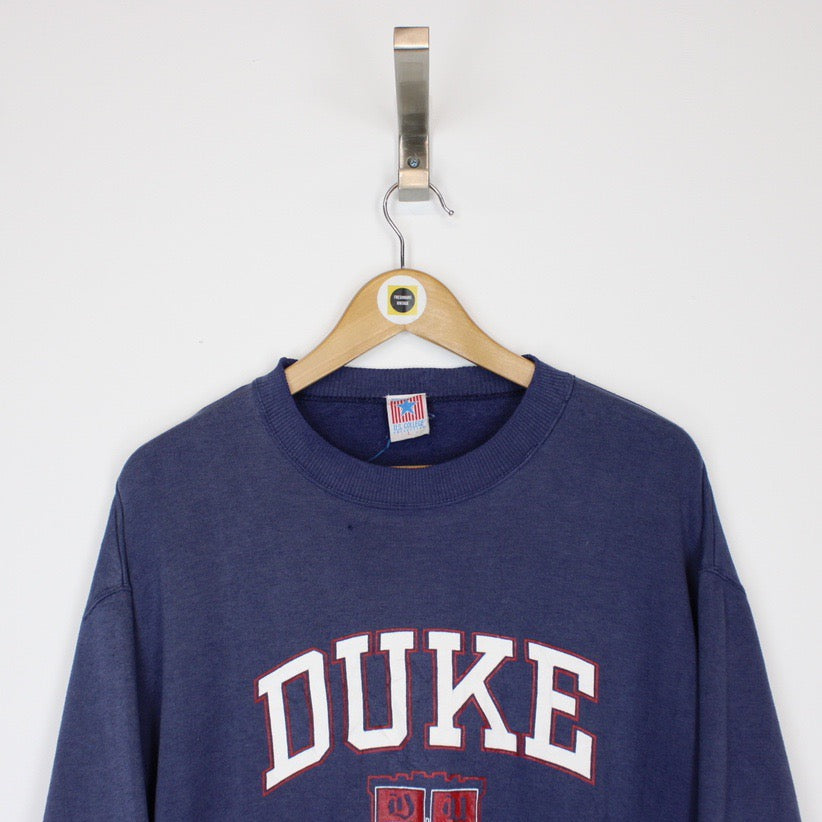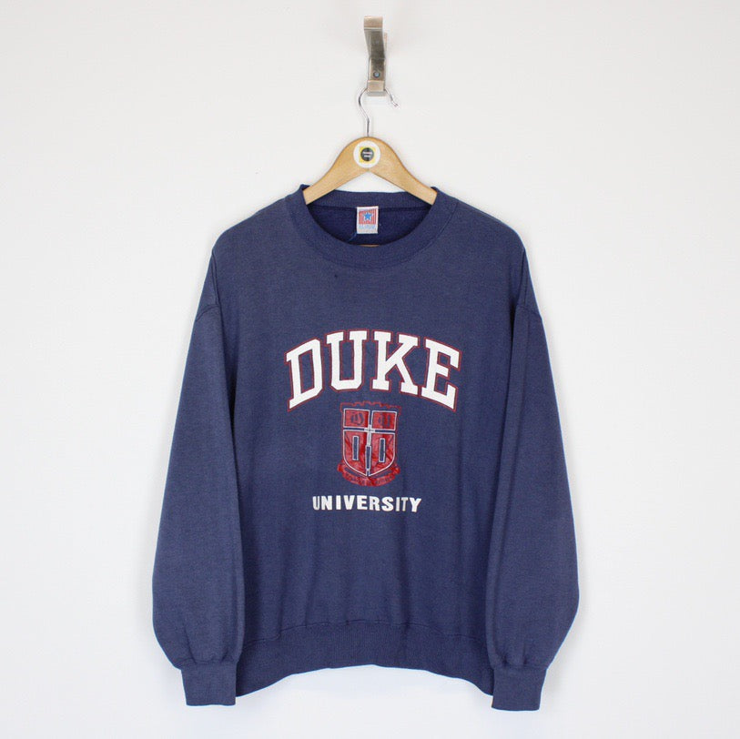 Vintage 90's Duke University USA Blue Spellout Crew Neck Sweatshirt Jumper Size on label: Women's Large Our recommended size: Women's Large Pit to pit (inches): 22.5 Length (inches): 24.5 All products listed are vintage unless stated otherwise in the description. These items are pre-loved and pre-worn, resulting in small signs of wear and minor fading. We think this adds to their unique authenticity - The item has a pin hole to the front, this is reflected in the price Please contact us if you have any further questions