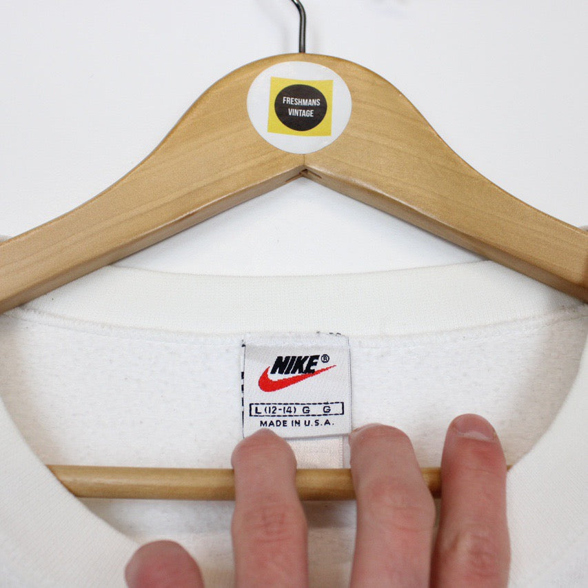 Vintage 90's Nike White and Black Crew Neck Central Swoosh Sweatshirt Jumper Size on label: Women's Large Our recommended size: Baggy Women's Large Pit to pit (inches): 26 Length (inches): 25 All products listed are vintage unless stated otherwise in the description. These items are pre-loved and pre-worn, resulting in small signs of wear and minor fading. We think this adds to their unique authenticity, but if an item has any major flaws these will be stated below. Please contact us if you have any further questions!