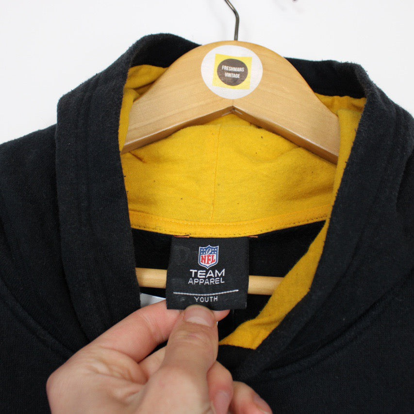 Vintage Pittsburgh Steelers NFL Black USA Pullover Spellout Hoodie Jumper Size on label: N/A Our recommended size: Women's Large Pit to pit (inches): 22 Length (inches): 25 All products listed are vintage unless stated otherwise in the description. These items are pre-loved and pre-worn, resulting in small signs of wear and sometimes minor flaws. We think this adds to their unique authenticity, but if an item has any bigger flaws these will be stated. Please contact us if you have any further questions!