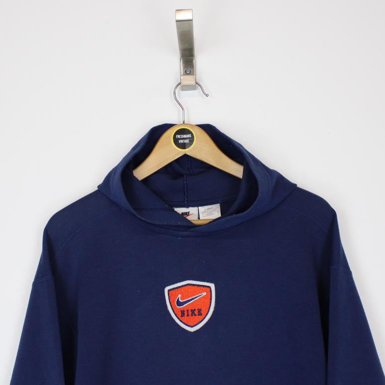 Vintage 90's Nike Navy Blue Pullover Spellout Hoodie Jumper Size on label: XL Our recommended size: Medium Pit to pit (inches): 22.5 Length (inches): 26.5 All products listed are vintage unless stated otherwise in the description. These items are pre-loved and pre-worn, resulting in small signs of wear and sometimes minor flaws. We think this adds to their unique authenticity, but if an item has any bigger flaws these will be stated. - The hoodie does have a couple of marks to the back, this is reflected in the price Please contact us if you have any further questions!