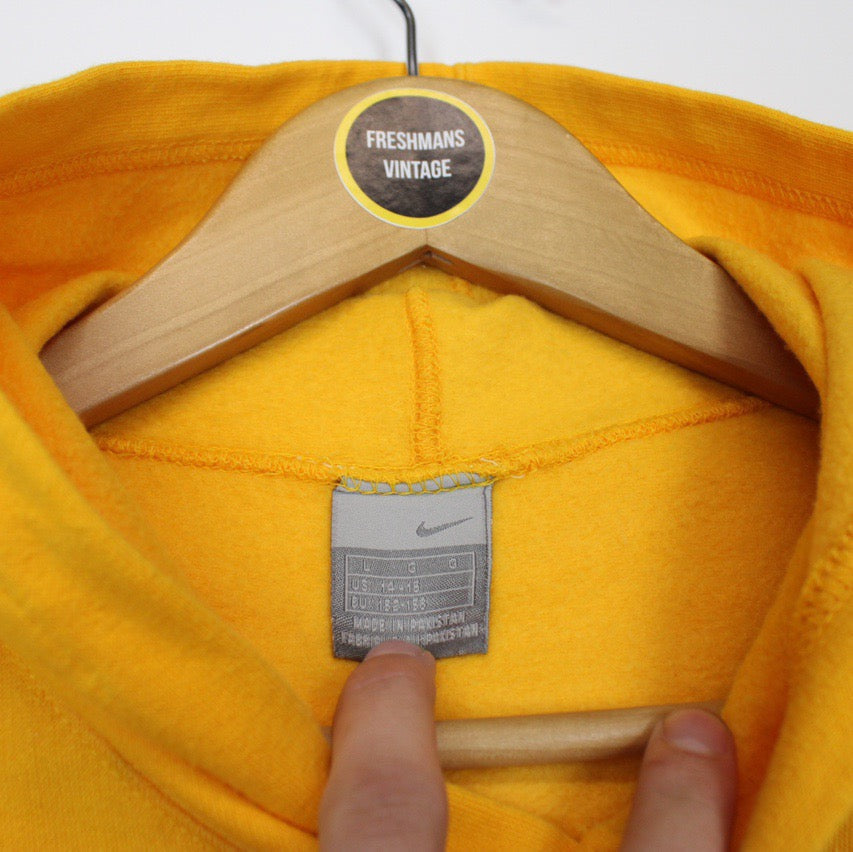 Vintage 00's Nike Yellow Pullover Central Swoosh Hoodie Jumper Size on label: Women's Large Our recommended size: Women's Medium Pit to pit (inches): 22 Length (inches): 25.5 All products listed are vintage unless stated otherwise in the description. These items are pre-loved and pre-worn, resulting in small signs of wear and minor fading. We think this adds to their unique authenticity, but if an item has any major flaws these will be stated below. Please contact us if you have any further questions!