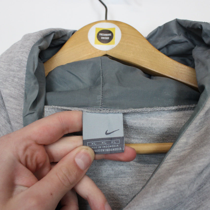 Vintage 00's Nike Grey and Black Pullover Central Swoosh Hoodie Jumper Size on label: XL Our recommended size: Medium Pit to pit (inches): 23 Length (inches): 26.5 All products listed are vintage unless stated otherwise in the description. These items are pre-loved and pre-worn, resulting in small signs of wear and sometimes minor flaws. We think this adds to their unique authenticity, but if an item has any bigger flaws these will be stated. - The hoodie does have a light mark to the front, this is reflected in the price Please contact us if you have any further questions!