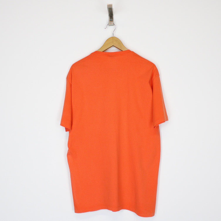 Vintage 00's Polo Ralph Lauren Orange Crew Neck Short Sleeve T-Shirt Size on label: Medium Our recommended size: M/L Pit to pit (inches): 21 Length (inches): 31 All products listed are vintage unless stated otherwise in the description. These items are pre-loved and pre-worn, resulting in small signs of wear and minor fading. We think this adds to their unique authenticity, but if an item has any major flaws these will be stated below. - The t-shirt does have some prominent marking throughout the front, this is reflected in the price Please contact us if you have any further questions!