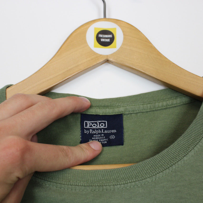 Vintage 00's Polo Ralph Lauren Green Crew Neck Short Sleeve T-Shirt Size on label: Medium Our recommended size: Medium Pit to pit (inches): 23 Length (inches): 27.5 All products listed are vintage unless stated otherwise in the description. These items are pre-loved and pre-worn, resulting in small signs of wear and minor fading. We think this adds to their unique authenticity, but if an item has any major flaws these will be stated below. - The t-shirt does have a few marks throughout, this is reflected in the price Please contact us if you have any further questions!
