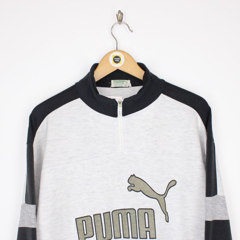 Vintage 90's Puma Light Grey and Black Pullover 1/4 Zip Spellout Sweatshirt Jumper Size on label: 160 Our recommended size: Medium Pit to pit (inches): 22.5 Length (inches): 26.5 All products listed are vintage unless stated otherwise in the description. These items are pre-loved and pre-worn, resulting in small signs of wear and fading. We think this adds to their unique authenticity, but if an item has any major flaws these will be stated. Please contact us if you have any further questions!