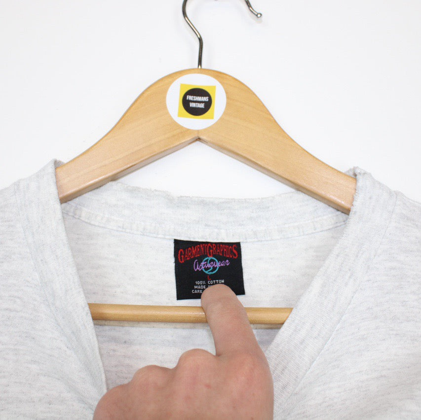Vintage 1993 Warner Bros Light Grey Crew Neck Short Sleeve Spellout T-Shirt Size on label: Large Our recommended size: Large Pit to pit (inches): 20.5 Length (inches): 30 All products listed are vintage unless stated otherwise in the description. These items are pre-loved and pre-worn, resulting in small signs of wear and minor fading. We think this adds to their unique authenticity, but if an item has any major flaws these will be stated below. Please contact us if you have any further questions!