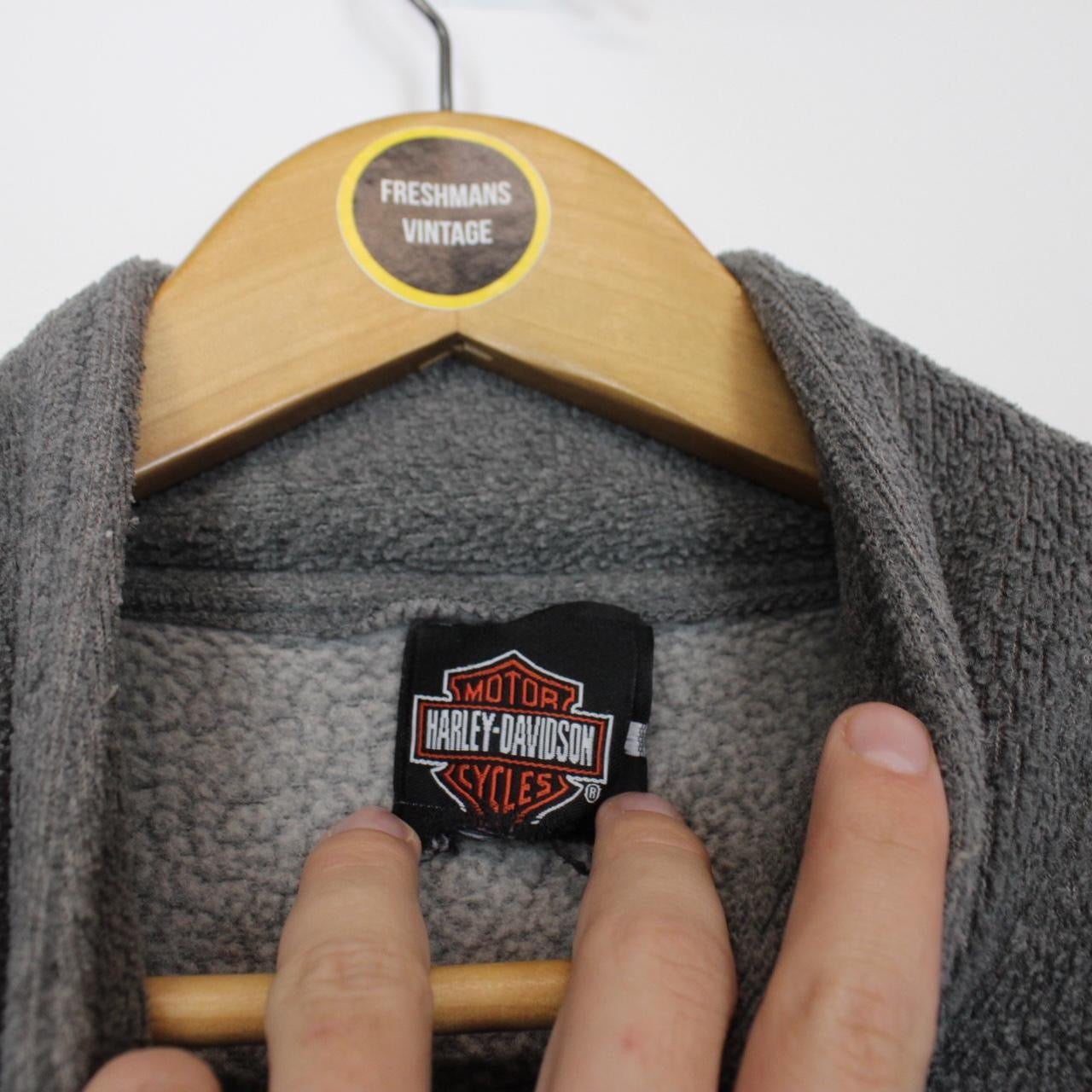 Vintage 2005 Harley Davidson Grey and Black 1/4 Zip Spellout Fleece Jumper Size on label: N/A Our recommended size: XL Pit to pit (inches): 26 Length (inches): 29 Condition: Very good condition All our products are pre-worn unless stated otherwise in the description. These items have been worn, resulting in signs of wear and use. If an item has any major flaws these will be stated above in the condition section. Please contact us if you have any further questions!