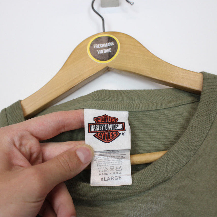 Vintage 2016 Harley Davidson South Dakota Green Short Sleeve Graphic Spellout T-Shirt Size on label: XL Our recommended size: XL Pit to pit (inches): 22.5 Length (inches): 29 All products listed are vintage unless stated otherwise in the description. These items are pre-loved and pre-worn, resulting in small signs of wear and minor fading. We think this adds to their unique authenticity, but if an item has any major flaws these will be stated below. Please contact us if you have any further questions!