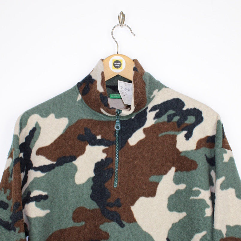 Vintage 90's Benetton Brown, Khaki and Cream Camo Print 1/4 Zip Pullover Fleece Jumper - in very good worn condition - men's size Small, measures 22 inches pit to pit and 25 inches length
