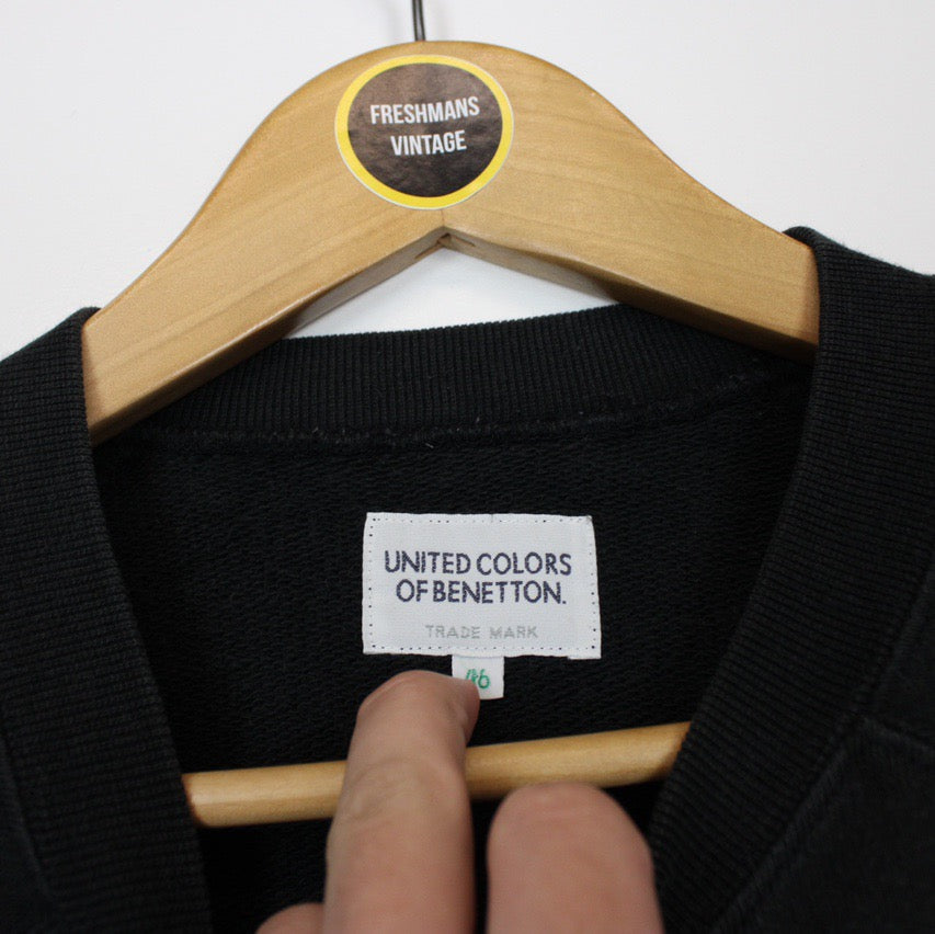 Vintage 90's Benetton Black and Multicoloured Spellout Sweatshirt Jumper Size on label: 46 Our recommended size: Small Pit to pit (inches): 22 Length (inches): 24.5 All products listed are vintage unless stated otherwise in the description. These items are pre-loved and pre-worn, resulting in small signs of wear and minor fading. We think this adds to their unique authenticity, but if an item has any major flaws these will be stated below. - The sweatshirt does have some slight discolouration to the front, this is reflected in the price Please contact us if you have any further questions!