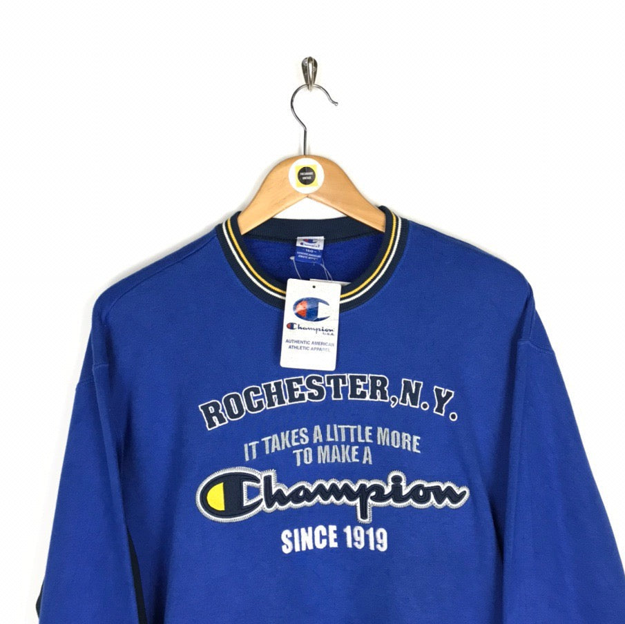 Vintage 90's BNWT Champion Reverse Weave Blue and White Spellout Crew Neck Sweatshirt Jumper