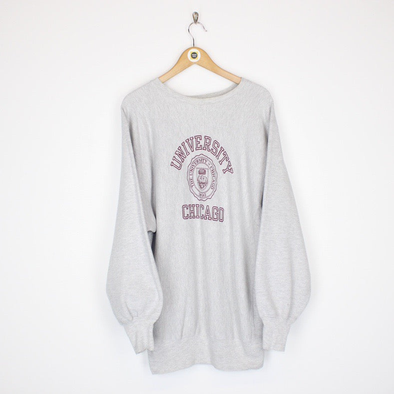 Vintage 90's Champion Light Grey University of Chicago USA Crew Neck Sweatshirt Jumper - in very good worn condition, has the embroidered Champion logo on the sleeve and printed spellout. - men's size XXL, 25 inches pit to pit and 31 inches length