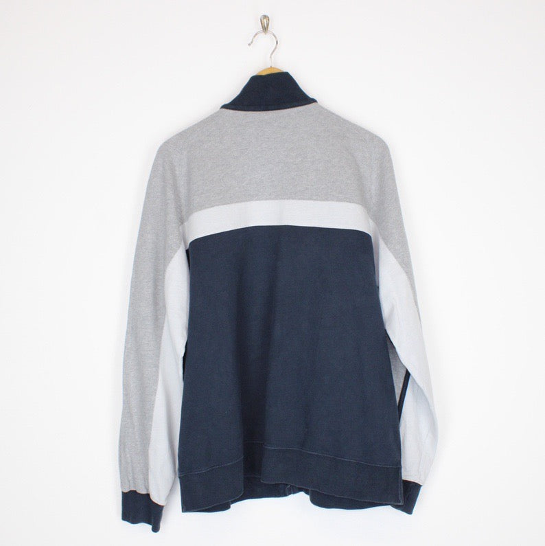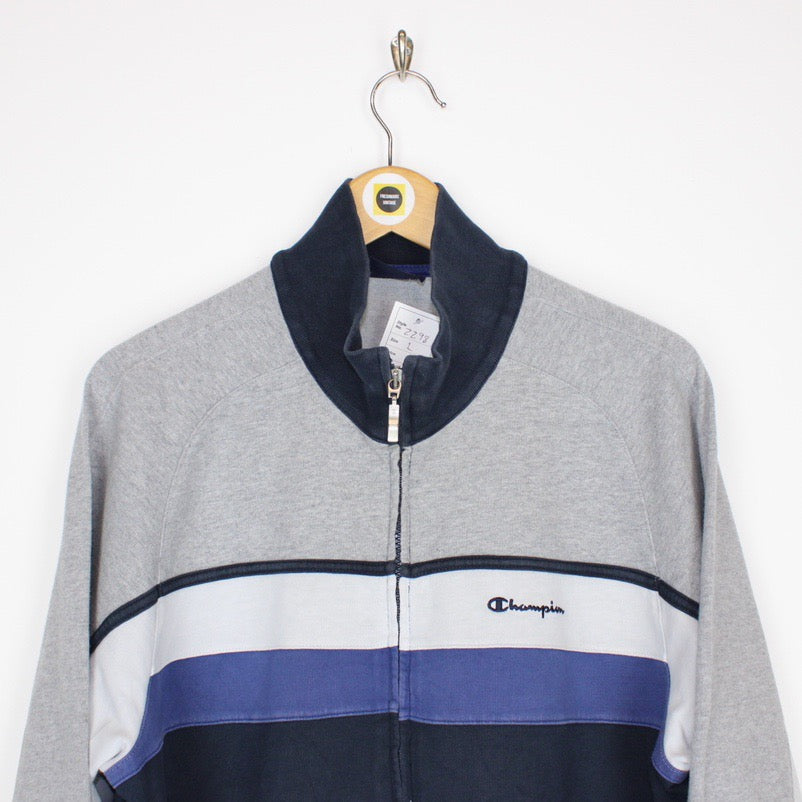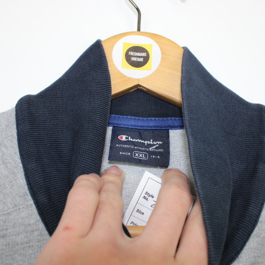 Vintage 90's Champion Grey, Navy Blue and White Spellout Zip Up Track Jacket Size on label: Large Our recommended size: Large Pit to pit (inches): 23 Length (inches): 28 All products listed are vintage unless stated otherwise in the description. These items are pre-loved and pre-worn, resulting in small signs of wear and minor fading. We think this adds to their unique authenticity, but if an item has any major flaws these will be stated below. Please contact us if you have any further questions!