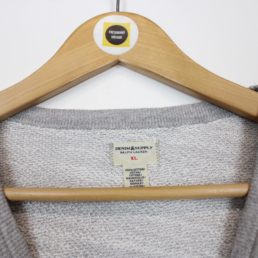 Vintage 00's Denim & Supply Ralph Lauren Grey Crew Neck Sweatshirt Jumper Size on label: XL Our recommended size: XL Pit to pit (inches): 24.5 Length (inches): 28 All products listed are vintage unless stated otherwise in the description. These items are pre-loved and pre-worn, resulting in small signs of wear and fading. We think this adds to their unique authenticity, but if an item has any major flaws these will be stated. - The sweatshirt does have a prominent mark to the back, this is reflected in the price Please contact us if you have any further questions!