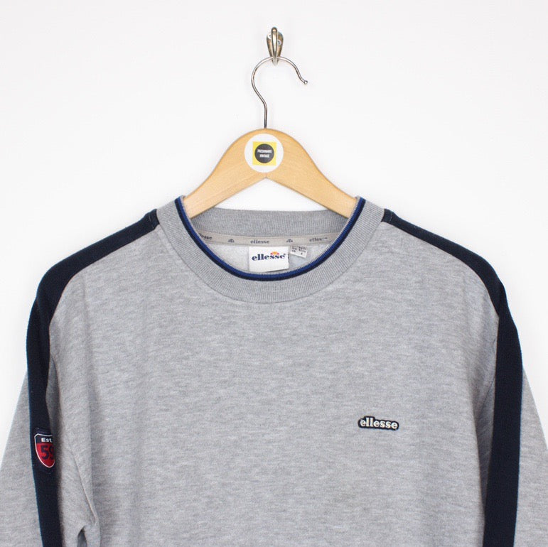 Vintage 90's Ellesse Grey and Black Crew Neck Spellout Sweatshirt Jumper - in very good worn condition, has black accents and the Ellesse spellout embroidered on the chest - men's size Small, measures 21 inches pit to pit and 25 inches in length