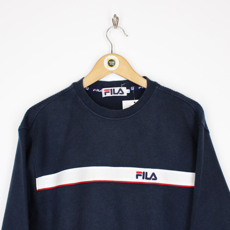 Vintage 90's Fila Navy Blue and White Crew Neck Spellout Sweatshirt Jumper Size on label: Small Our recommended size: Small Pit to pit (inches): 21 Length (inches): 26.5 All products listed are vintage unless stated otherwise in the description. These items are pre-loved and pre-worn, resulting in small signs of wear and minor fading. We think this adds to their unique authenticity, but if an item has any major flaws these will be stated below. Please contact us if you have any further questions!