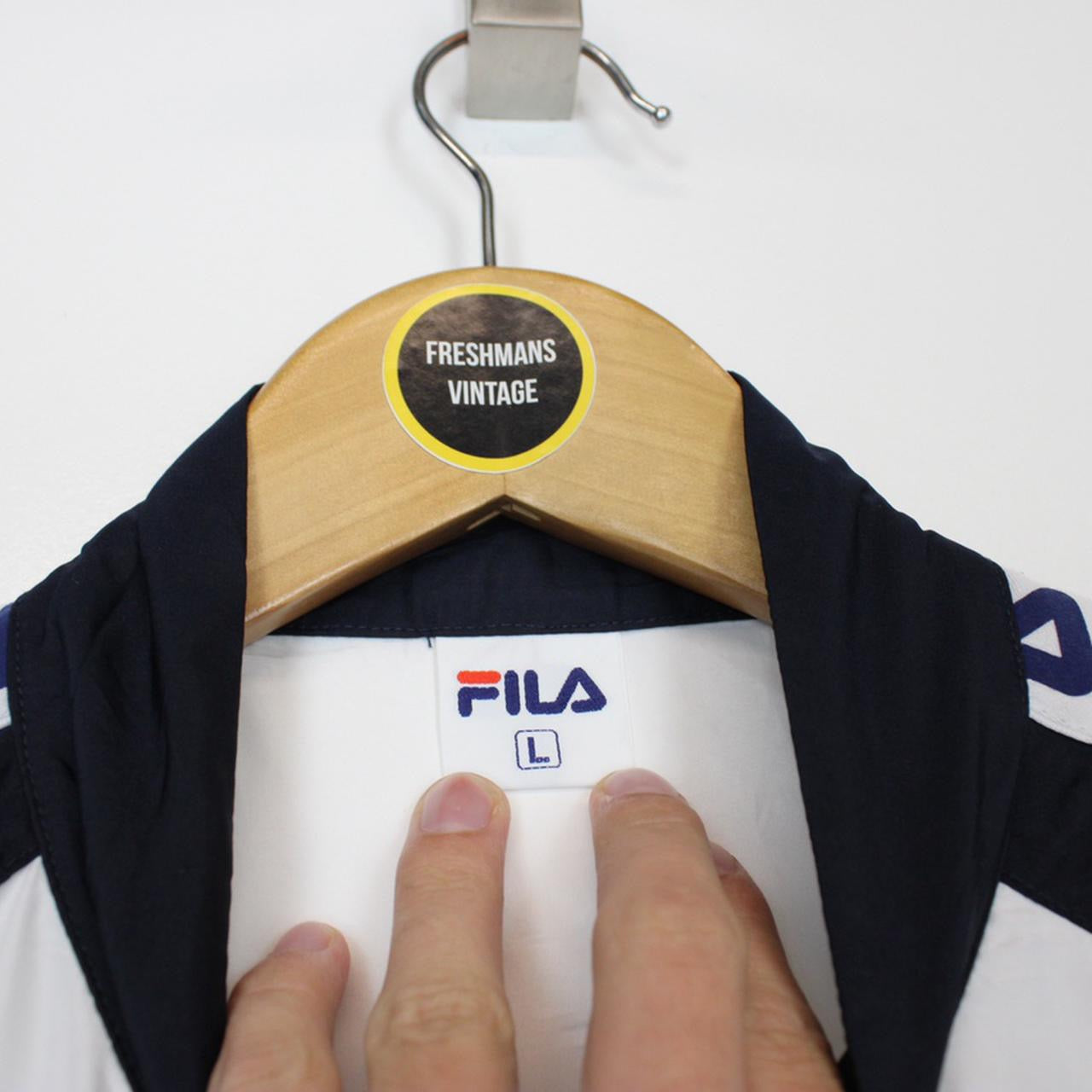 Vintage 00's Fila White and Navy Blue Full Zip Spellout Track Jacket Size on label: Large Our recommended size: Large Pit to pit (inches): 22 Length (inches): 27 All products listed are vintage unless stated otherwise in the description. These items are pre-loved and pre-worn, resulting in small signs of wear and fading. We think this adds to their unique authenticity, but if an item has any major flaws these will be stated. Please contact us if you have any further questions!