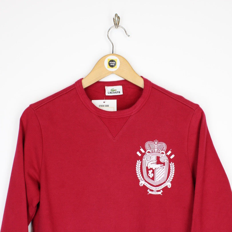 Vintage 00's Lacoste Red and White Crew Neck Spellout Sweatshirt Jumper Size on label: Size 2 Our recommended size: Small Pit to pit (inches): 19 Length (inches): 26 All products listed are vintage unless stated otherwise in the description. These items are pre-loved and pre-worn, resulting in small signs of wear and minor fading. We think this adds to their unique authenticity, but if an item has any major flaws these will be stated below. Please contact us if you have any further questions!