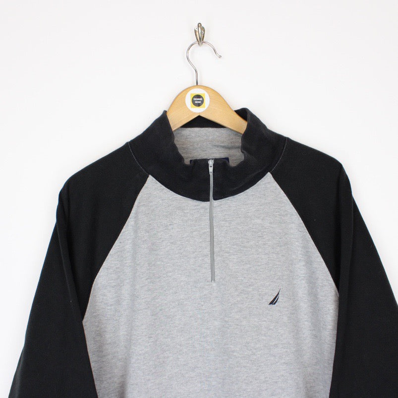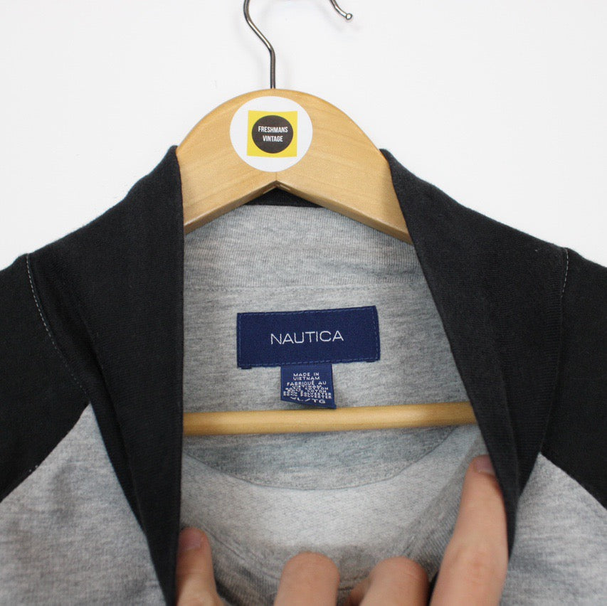 Vintage 90's Nautica Light Grey and Black Pullover 1/4 Sweatshirt Jumper - in very good worn condition, has the classic logo on the chest - men's size XL, pit to pit measures 24 inches and the length 30 inches