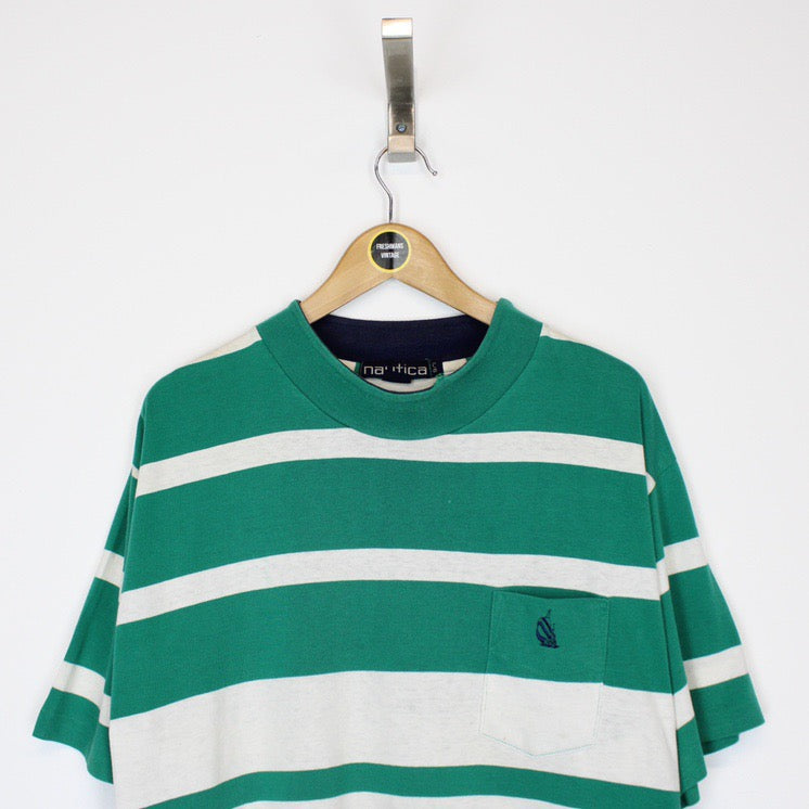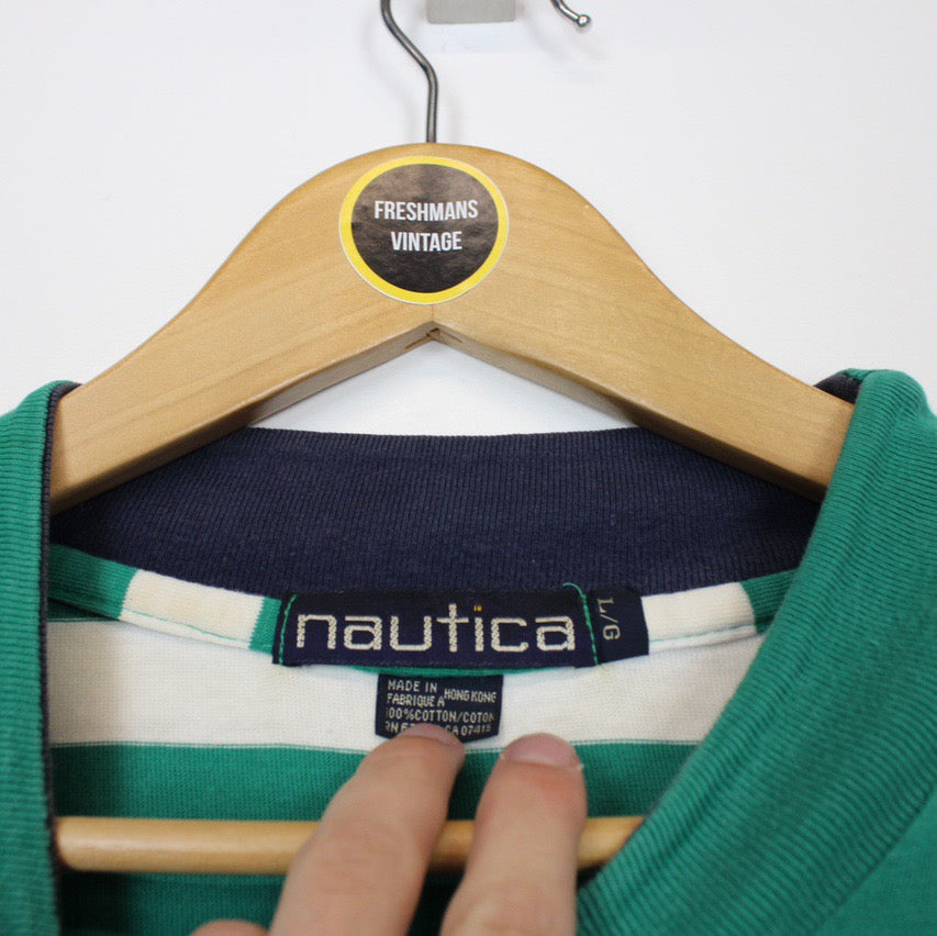 Vintage 90's Nautica Green and White Striped Crew Neck Short Sleeve T-Shirt Size on label: Large Our recommended size: Large Pit to pit (inches): 21 Length (inches): 29 All products listed are vintage unless stated otherwise in the description. These items are pre-loved and pre-worn, resulting in small signs of wear and minor fading. We think this adds to their unique authenticity, but if an item has any major flaws these will be stated below. - The t-shirt does have a large hole to the front along with a few marks, this is reflected in the price Please contact us if you have any further questions!