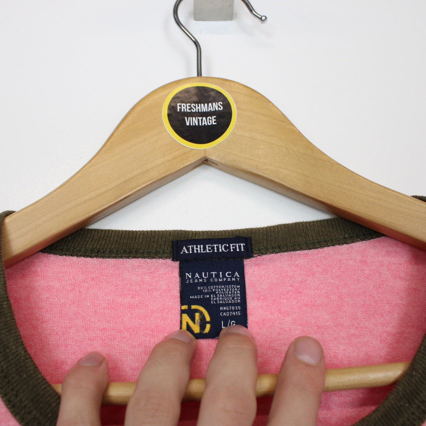 Vintage 90's Nautica Pink Crew Neck Short Sleeve Spellout T-Shirt Size on label: Large Our recommended size: Large Pit to pit (inches): 22.5 Length (inches): 28 All products listed are vintage unless stated otherwise in the description. These items are pre-loved and pre-worn, resulting in small signs of wear and minor fading. We think this adds to their unique authenticity, but if an item has any major flaws these will be stated below. Please contact us if you have any further questions!