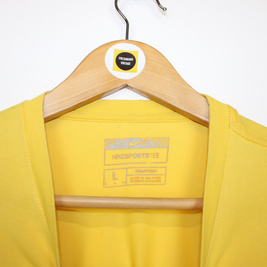 Vintage 00's Nike Yellow Crew Neck Short Sleeve T-Shirt Size on label: Large Our recommended size: Large Pit to pit (inches): 22 Length (inches): 29 All products listed are vintage unless stated otherwise in the description. These items are pre-loved and pre-worn, resulting in small signs of wear and minor fading. We think this adds to their unique authenticity, but if an item has any major flaws these will be stated below. - The t-shirt has 2 marks to the front and a mark to the back, this is reflected in the price Please contact us if you have any further questions!