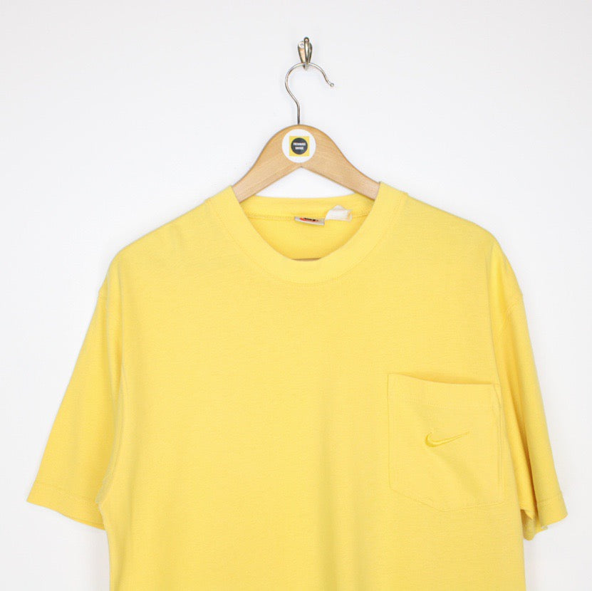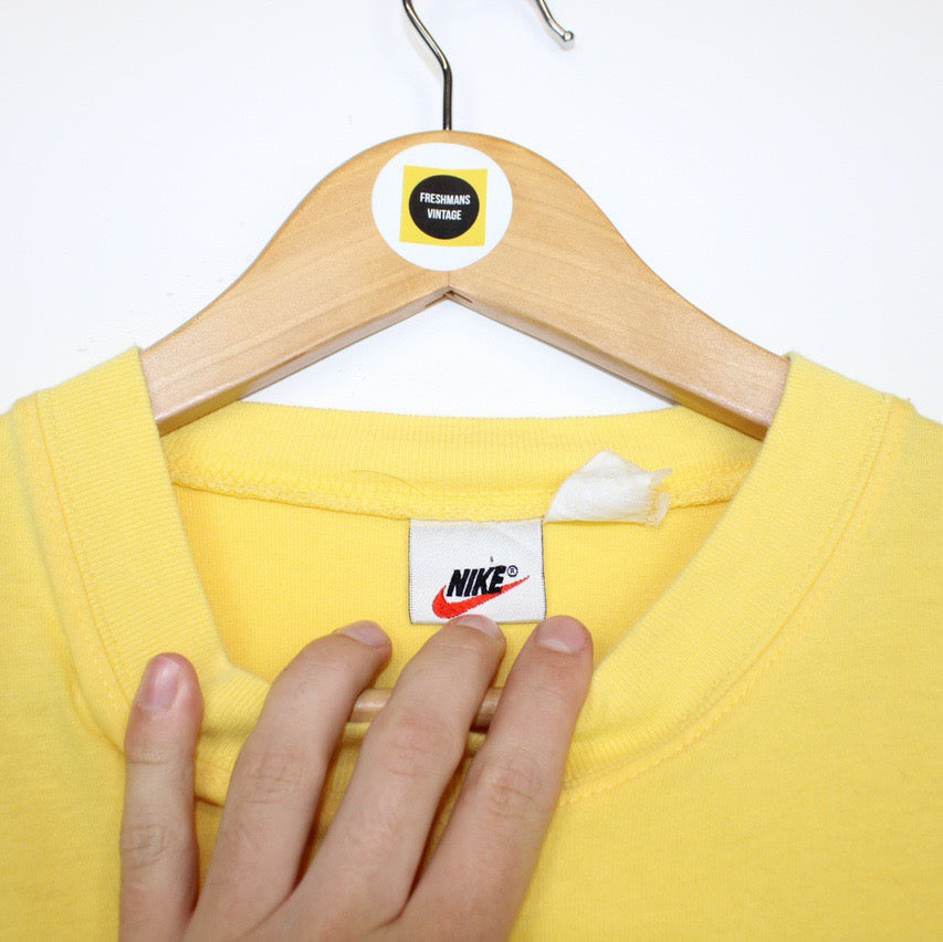 Vintage 90's Nike Yellow Crew Neck Short Sleeve Swoosh T-Shirt Size on label: Large Our recommended size: Large Pit to pit (inches): 22 Length (inches): 30 All products listed are vintage unless stated otherwise in the description. These items are pre-loved and pre-worn, resulting in small signs of wear and minor fading. We think this adds to their unique authenticity, but if an item has any major flaws these will be stated below. Please contact us if you have any further questions!